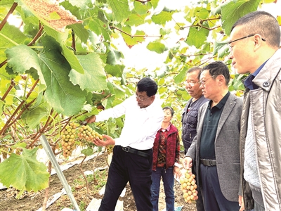■高维玉(左)带领村民在种植大棚里查看葡萄长势。 李德银 摄