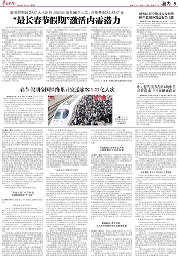 全国重点零售和餐饮企业日均销售额较2025年春节假期增长5.7%、超28亿人次跨区域出行、国内出游5.96亿人次、国内出游总花费8034.83亿元、北京轨道交通27个在建标段不停工……长达9天的“最长春节假期”里,一幕幕火热的消费画面、不断刷新的项目建设“进度条”,折射出内需动力愈发强劲。