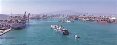 ■春节期间的山东港口青岛港,穿梭往来的集装箱货轮繁忙有序。 赵健鹏 摄