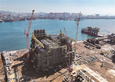 ■海洋石油工程(青岛)有限公司施工现场,固定式海洋平台上部组块正在加紧建造。 赵健鹏 摄