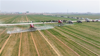 ■在青岛西海岸新区大场镇绿色增粮先行示范区麦田里,两台自走式撒肥机驶入麦田进行追肥作业。 青岛西海岸新区大场镇供图
