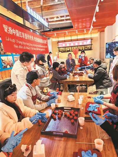活动现场,越南游客认真跟随非遗传承人学习熬糖、串果、裹糖等制作流程,互相交流、兴致盎然,亲手制作的糖球让他们爱不释手。