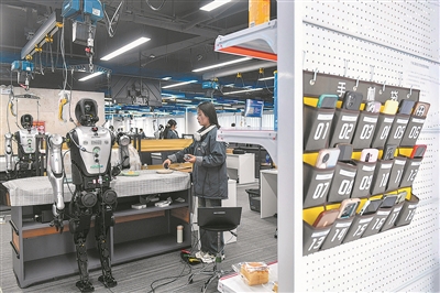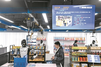 ■在超市场景下,数据采集员正在“指导”机器人完成货架商品摆放。 韩 星 摄
