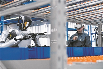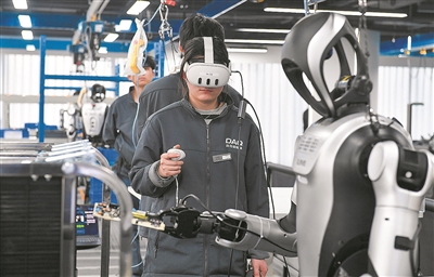 ■数据采集员头戴VR眼镜操控机器人分拣汽车零部件。赵健鹏 摄