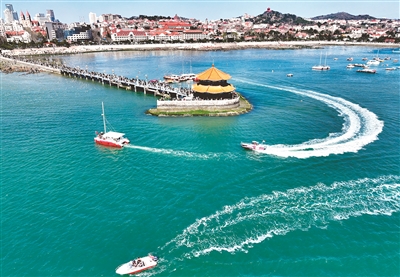 清明假期的青岛春光明媚。在栈桥附近的海面上,一艘艘游船以海为画布、以船为画笔,绘出了一幅幅精美的海上游画卷。 王 雷 摄