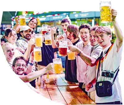 ▼外国游客在第35届青岛国际啤酒节上畅饮。