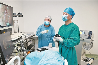 ■高玉强(右一)为患者开展内镜下手术。 黄 飞 摄