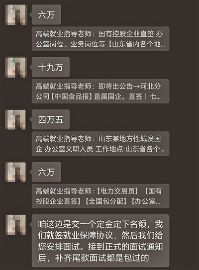 与小崔一样,多名求职者也被这种套路欺骗,并向相关部门投诉。但该中介公司并未收手,依然在发布所谓“高端就业”的内推信息。记者在其微信公众号上看到,发布的招聘岗位涵盖高校、医院、机场、烟草、电力等热门行业。记者以求职者身份添加了自称“高端就业指导老师”的微信号,对方推荐了某国有控股企业直签业务员、山东某地国企办公室文员等岗位,并明码标价,服务费从4.5万元到19万元不等。
