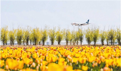 ■飞机从郁金香花海上方低空掠过,定格独属于青岛空港的春日浪漫。