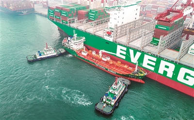 ■青岛港内,甲醇加注船“建航利达”轮靠近货轮准备开展加注作业。