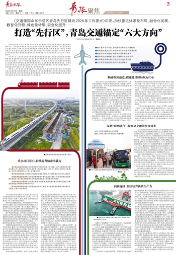 2026年是实施“十五五”规划的开局之年,也是交通强国山东示范区青岛先行区建设的深化提升之年。加快建设交通强国山东示范区青岛工作机制日前印发《交通强国山东示范区青岛先行区建设2026年工作要点》,今年将围绕稳投资、强枢纽、优服务、促改革、惠民生、保安全,加快推进体系化布局、融合化发展、数智化升级、绿色化转型、安全化提升,努力绘就“人享其行、物畅其流”的美好出行图景,推动青岛交通现代化水平持续走在山东乃至全国前列,为“十五五”开好局、起好步。