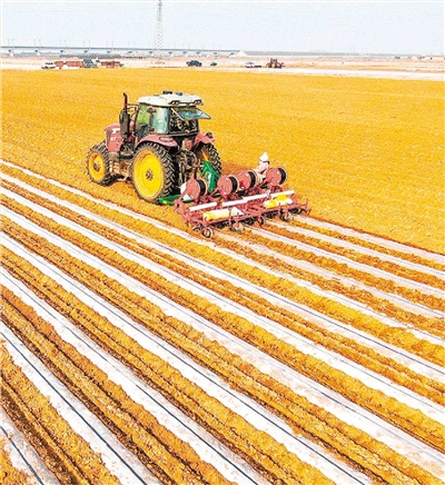 种粮大户王高先站在地头,弯腰扒开刚覆好的土,露出整齐的种薯。“我种了1450亩马铃薯,机器带导航,耕地、播种、覆膜一步到位,减少进地次数,保护土壤。你看这耕深能达40厘米左右,根系扎得深,苗肯定壮,预计能大幅提升亩产。”王高先难掩喜悦。