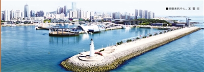 每次驻足奥帆中心,都会感受到一种震撼。广场、堤岸、帆影,林立的船桅、千米长堤、隔海耸立的摩天楼群、造型如巨大鸥鸟振翅欲飞的国际会议中心……入夜,渔火繁星共同闪烁,楼群变幻无穷的灯光秀使天幕美不胜收,令大海流光溢彩。