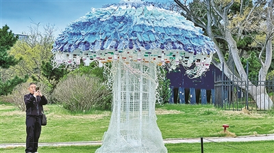 ■观展市民在一个由废弃塑料瓶制作而成的雕塑作品前驻足拍照。