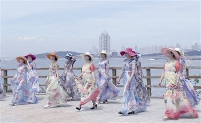 “花漾大姨”走秀 7月25日上午,“青岛花漾大姨”亮相青岛网红景点太平角木栈道。“青岛花漾大姨”这群时尚的青岛“大姨”是市南区文化馆模特队成员,她们虽年过半百,但时髦的发型、十足的活力、精致的妆容、优雅的体态、轻盈的步伐,让围观路人羡慕不已。
