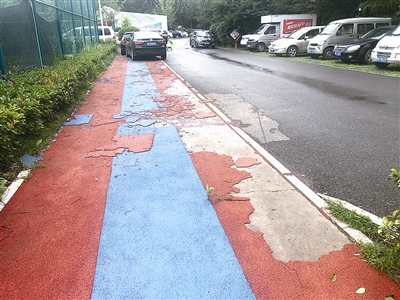 日前,记者实地探访时看到,公园内的塑胶健身步道已多处开裂、破损,尤其是停车场附近的健身步道,破坏尤为严重。记者采访时,恰遇一辆私家车驶来,司机发现没有空余停车位后,直接将车停在了健身步道上。车轮来回碾压,加剧了塑胶健身步道的破损。“健身步道之所以会开裂、破损,固然有其自身老化的原因,但也与公园的管理、养护不到位有一定关系。”郑女士吐槽说。