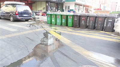 记者留意到,垃圾桶旁的污水从台东五路南侧一直流到道路北侧,绵延近15米。过往行人走到此处只能掩鼻躲避。“厨余垃圾本身就味道难闻,天这么热,味道更是让人‘上头’。而且,垃圾处理不及时,极易滋生细菌、蚊虫,影响周边居民健康。” 刘先生表示。