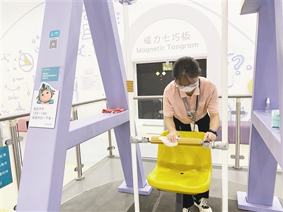 作为青岛新晋“网红”打卡点,位于市南区江西路11号的海信探索中心深受亲子游客喜爱,负责安检工作的牟立波几乎每天都要劝返四到五组游客,这些游客来自中高风险地区,无法提供符合要求的健康证明。“疫情防控是第一位的,我们都是先按要求进行防疫检查,再检票,并帮助劝返的游客免费办理退票。”牟立波说。“整个场馆的防疫做得很细致,带着孩子来玩很放心。”市民于女士带着女儿和朋友的孩子正在体验VR项目,两名小游客自觉戴着口罩。小游客刚从展项上下来,科学辅导员就开始对设备擦拭消毒。海信探索中心不仅每个展项都坚持一客一消毒,不少地方更是只要孩子一摸过就马上消毒。此外,场馆每小时消毒一次,每日开闭馆前,还要用机器彻底消毒。场馆内,每隔几步就能看到免洗手消毒凝胶,游客可随时取用。保洁员随身携带着消毒剂,不放过每一个细节。