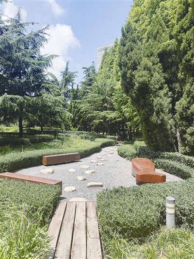 记者采访时正值午休时间,有不少上班族在公园内乘凉散步。记者看到,海尔路口袋公园虽小,但五脏俱全。蜿蜒曲折的慢跑道、植被环绕的木栈道、趣味十足的无动力游乐设施、造型独特的休闲座椅、干净整洁的洗手间……完善的休闲娱乐设施,为游人创造了一处可游可憩的休闲空间。