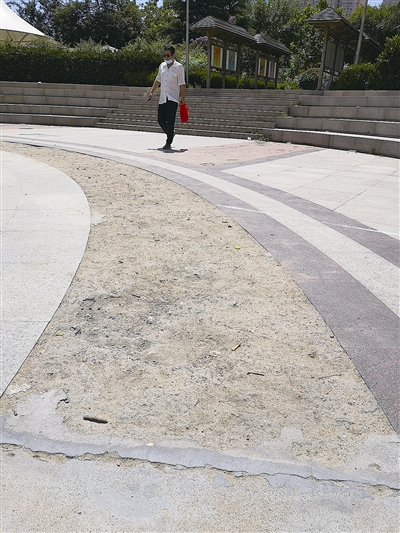 记者现场观察,在广场中央环形外圈,有超过一半的地面露出了水泥层,个别位置还被市民踩出了浅坑。在西北角区域,红色地砖出现了大面积破损。不少地方还存在台阶石破碎、地砖翘起问题。“这里地面破损已有几个月了,听说相关部门要修,但一直没进展。”市民王先生说,他居住在周边小区,每天会到广场晨练,步行至此都需格外谨慎。