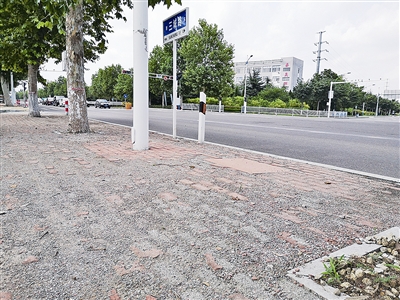 8月7日,记者探访三城路时看到,王先生所说的人行道破损位置是在平度市三城路青啤大道交叉口附近,地砖表面的破损程度不一,有的地砖已经露出了内部的水泥石子。“地砖破损后,地面出现了一层水泥石子,人走在路上,稍有不慎就有可能滑倒。”一位过路市民说,“我用鞋子摩擦破损的地砖,地面的水泥石子就会发出‘沙沙’的声音。从青啤大道三城路路口出发,沿三城路南侧人行道向西走约400米,不少地砖也破损了。”