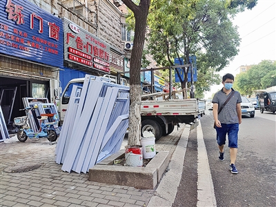 在一家挂着“锦湖轮胎”的洗车店前,记者注意到,等待清洗的车辆直接停靠在人行道上,排队进入洗车房,待冲洗完毕后,又开到人行道上等待擦拭。洗车的污水从店内流出,人行道变得十分湿滑。不仅如此,店主还用十余条废弃轮胎和一张躺椅堵住了整条人行道,人行道上方拉着晾衣绳,擦车用的毛巾挂在绳上。行人经过时,不仅要躲避飞溅的水花,还要钻车缝、弯腰杆。此外,几家塑钢门窗店也无一例外地将塑钢门窗、板材、配件等堆放在人行道上。