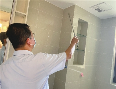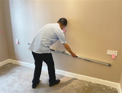 了解过新房情况并准备好工具后,验房师兵分两路开始工作。薛总监先用直角尺和靠尺检查了客厅和卧室的对角方正度,这一项表现良好。可是测量到墙面平整度时,便发现主卧室墙面平整度差达5-6mm。次卧北墙面平整度差最为严重,达13mm。来到厨房、卫生间,只见薛总监用空鼓锤逐一敲击每一块瓷砖,当听到敲击声异样后,便再次敲击辨认。经过一番细致的检查,薛总监发现厨房墙面共有5处空鼓,客卫空鼓25处,主卫空鼓22处,而且瓷砖嵌缝粗糙,看上去并不美观。“没想到卫生间的空鼓问题这么严重,买房子的时候还想着是品牌房企质量有保障,现在真是有苦说不出。”看着已经大规模维修过的墙面又被贴了条,方先生犯了难。