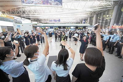 | ■8月11日20时30分,流亭机场员工合唱了歌曲《明天会更好》,告别流亭机场。宋新华 摄 |