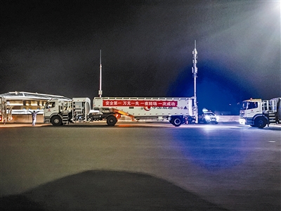 | ■8月11日22时许,一辆辆转运车停靠在胶东机场周边,等待进场。 吴 帅 摄 |