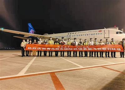 | ■8月12日0时许,流亭机场首架调机飞抵胶东机场停机坪。 刘 栋 摄 |