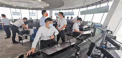 | ■8月12日8时许,青岛空管站管制员准备就绪。 宋新华 摄 |
