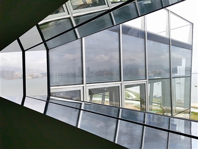 正午,阳光强烈,在玻璃和阳极氧化铝板为主体的建筑群外墙上投射出奇妙的光影。延伸的外廊顶棚天花板也如镜面一般,倒映出附近的树木、海面、船影,为西海美术馆镀上一层耀目的色彩,远远望去,如海市蜃楼,横空出世。