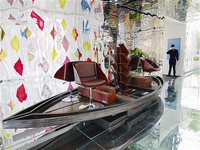 宋冬的作品《方圆济》灵感同样源自美术馆的海岸,他也依托那间方圆兼济的展厅空间,利用曲面镜的反射,重新塑造了海上的渔船。镜面的反射形成了一整条虚实兼有的渔船。船体是跷跷板结构,用日常的家具物品组成一个歇脚的空间,同时也是一个可以思考交流的空间。据说展览中,艺术家本人也会坐于“船”中,与观者进行真实的对话交流,并收集来自当地居民的真实故事。
