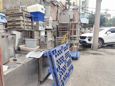 饭店“后巷”脏乱的情况绝非个例。有市民反映,在闽江路158号院内,多家饭店利用公共区域乱堆乱放。记者探访时发现,闽江路158号的一层是沿街饭店,饭店的后门开在背街的居民院内,网点以上是居民楼。记者看到,院内堆放着不少厨房用具,大到操作台、商用锅灶、洗刷台,小到汤桶、周转箱、筛水盆,可谓应有尽有。“这些厨房用具堆在院子里足足有三四米高,挤占了居民的公共区域。”一名居民吐槽说,“最让人难以忍受的是放置在院里的餐饮垃圾桶。”