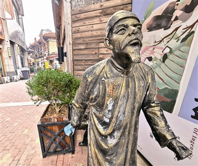 8月16日,记者来到即墨区蓝鳌路、墨城路路口附近的七星街区域探访。从白石岩路向东转入七星街,街口竖着“文化街区、美食地标”的招牌,街道两侧餐饮店铺密集,时至中午,街区内人来人往,食客在餐饮店进进出出,不少外卖小哥穿梭送餐。街区内设置了多处仿铜雕塑,但雕塑普遍存在破损问题。