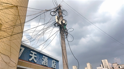 记者向北前行,来到路口北侧的7天连锁酒店,只见酒店楼体上的线缆纠缠在一起,杂乱无章。一根水泥线杆矗立在酒店旁边,上面设备箱的盖子大开,露出了里面的设备元件,五六十根粗细不等的线缆通过设备箱,在线杆上纵横缠绕混搭,然后延伸到酒店楼体上。由于多根线缆挂在上面,干净整洁的墙面宛如附上了一张蜘蛛网。