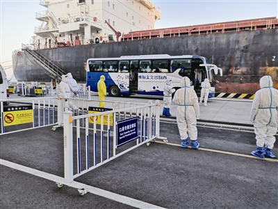 “船舶抵港前,首先按照防疫流程,将船舶、人员等信息提前报备。”市北海港管控部负责人杨国江介绍,船舶抵港靠岸后,港区防控人员会对梯口进行消杀,船员们须沿着下船通道有序进入码头隔离区,接受边检人员入境检查。同时,市北海港管控部与大港海关、应急转运人员在“三区一通道”进行交接,由停靠在隔离通道的应急转运车将船员们运至隔离酒店,全程闭环管理。转运完毕,防控人员对现场进行严格消杀,不留隐患。