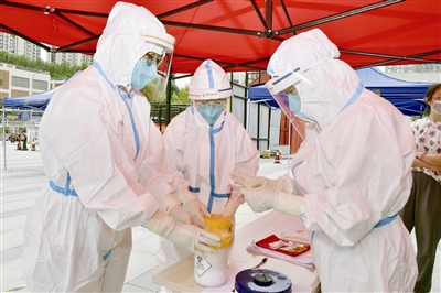 8月13日一早,在保利广场上班的乔国栋就来到和达中心城广场,参加由双山街道组织的全员核酸检测实战演练,现场让他惊讶不已:“从测量体温、扫码登记到做完采样,前后用了不到两分钟。去年在青岛进行全员核酸检测时,工作人员手写记录个人信息就至少得两三分钟。”