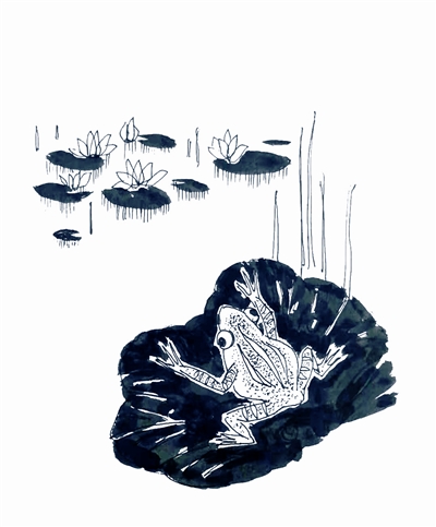 早晨和傍晚无人涉足的时候,这湾就变成了青蛙的天地,老远处便会听到“呱呱”的一片蛙叫声。这里的蛙有多种颜色,有浑身绿色的,有带灰黄条纹的,有褐色的。肤色不同,其长相和叫声都有差异。那些颜色呈绿色和灰黄条纹的,长得比较光亮娇艳,行动也很灵巧,能腾空跳跃一两米,叫声清脆;那褐色的,长得比较丑陋,背部长满了难看的小疙瘩,以爬行为主,很少能跳跃,即便跳跃也跳不远,最多几十厘米,人们给它取了个名副其实的名字——癞蛤蟆,它的叫声也有些粗癞。然而,癞蛤蟆的叫声却是那一片蛙声合唱中不可或缺的和弦声,如同低音大提琴在交响乐中那不可替代的音色。