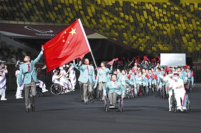 8月24日,第16届夏季残疾人奥林匹克运动会开幕式在日本东京举行,这是中国体育代表团入场。