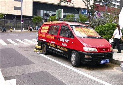 随后,记者在凤城路上同样发现了车位被私占的问题。只见一辆红色面包车停放在凤城路与连云港路交叉口的车位上,车身贴满了招租广告。记者注意到,面包车的前、后挡风玻璃均被贴上了广告,且左前轮轮胎已经完全漏气干瘪,无法正常行驶。