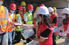 上午9时许,青岛福彩志愿者一行来到位于崂山区鱼水路的青岛地铁四号线登瀛车辆段施工现场,为地铁建设者们送去了矿泉水、冰袖、毛巾、清凉油等防暑降温物资。据悉,为确保地铁四号线登瀛车辆段车站10月份顺利封顶,地铁建设者们在三伏天里,每天工作十多个小时,在保证施工安全和质量的前提下,努力提高工作效率,为让岛城市民早日体验到更加便捷的地铁出行辛勤付出着。