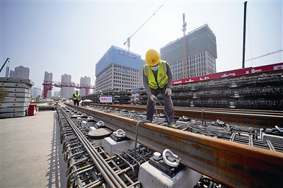 地铁4号线是贯穿市区中部的东西向骨干线路,西起人民会堂站,东至大河东站,线路全长约31公里,共设25座车站,全部为地下线。2021年7月,地铁4号线启动铺轨工作。地铁4号线轨道工程施工存在作业面不连续、施工场地狭小、交叉施工多等状况。为加快施工进度,建设单位在原有4座铺轨基地基础上增加了人民会堂站、劲松七路站、董家下庄站、南宅科站、沙子口站5个散铺基地,全面加大机械设备和人力投入,多点多面同步施工,铺轨高峰期同时开工20多个作业面,大型机械设备投入百余台,施工人数多达1500余人。“通过优化施工组织,调配优质资源,采用机铺、散铺相结合的工作模式,地铁4号线轨道铺设一次次刷新单日铺轨进度。”中国铁建青岛地铁4号线总承包管理部副指挥长张世雄告诉记者。今年3月以来,面对工期和防疫的双重压力,青岛地铁组建青年突击队,克服疫情影响和交叉作业等诸多困难,推动铺轨工作以“倍速”推进,顺利实现轨通目标。