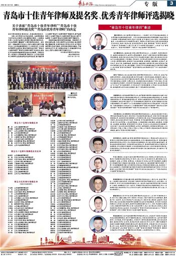 为深入学习贯彻习近平法治思想,全面贯彻落实习近平总书记对律师工作的重要指示精神,认真落实市第十三次党代会精神,更好展示青岛青年律师风采,充分运用榜样力量激励广大青年律师创先争优、成长成才,在建设新时代社会主义现代化国际大都市中建功立业,以优异成绩迎接党的二十大胜利召开,中共青岛市律师行业委员会、青岛市律师协会开展了“青岛市十佳青年律师”“青岛市优秀青年律师”评选活动。经各区市司法局和局直律师所党组织初评推荐,市律协初审,十佳竞评人员网络投票、演讲打分、公示等评选程序,市律师行业党委会和会长会研究决定:授予董杰等10名律师“青岛市十佳青年律师”荣誉称号,授予赵新辰等10名律师“青岛市十佳青年律师”提名奖,授予于金勇等79名律师“青岛市优秀青年律师”荣誉称号。