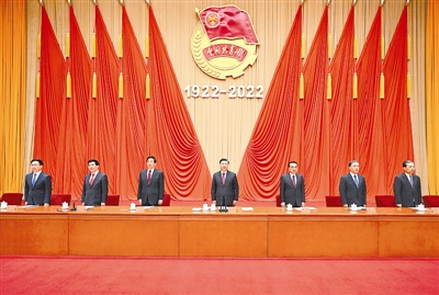 人民大会堂二层宴会厅气氛隆重热烈。主席台上方悬挂着“庆祝中国共产主义青年团成立100周年大会”会标,后幕正中悬挂团徽,团徽下方是“1922-2022”字标,10面红旗分列两侧。