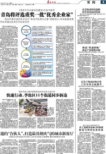 | 青岛日报社(集团)数字报纸(包括《青岛日报》、《青岛早报》、《青岛晚报》、《老年生活报》)的一切内容(包括但不限于文字、图片、PDF、图表、标志、标识、商标、版面设计、专栏目录与名称、内容分类标准以及为读者提供的任何信息)仅供青岛日报社(集团)读者阅读、学习研究使用,未经青岛日报社(集团)及相关权利人书面授权,任何单位及个人不得将青岛日报社(集团)数字报纸(包括《青岛日报》、《青岛早报》、《青岛晚报》、《老年生活报》)所登载、发布的内容用于商业性目的,包括但不限于转载、复制、发行、制作光盘、数据库、触摸展示等行为方式,或将之在非本站所属的服务器上作镜像。否则,青岛日报社(集团)将采取包括但不限于网上公示、向有关部门举报、诉讼等一切合法手段,追究侵权者的法律责任。 |