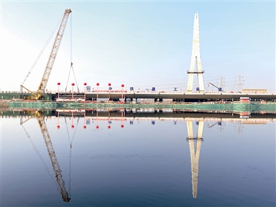 机器轰鸣、吊臂起降,在位于城阳区的墨水河大桥施工现场,300多米长的桥梁南北横跨在河水之上,一座近50米高的桥塔竖立在桥梁中部,施工人员和车辆在桥面上来回穿梭,呈现一片繁忙景象。