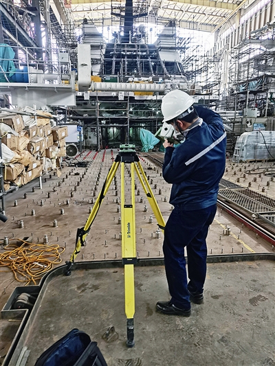 5月的广州,气温已超过30℃。船坞、船舱内更是嘈杂、湿热。船体、船舱、甲板等均需要测量,许方正与干明义需要抱着几十斤重的仪器,穿梭于密集的脚手架之间,不断上上下下。无人系统母船需要多团队协同施工,他们的工作时间也就无法自主确定,只要有测量时机,他们就会抓紧时间工作,有时在船舱里一待就是十几个小时。现场测量复杂,大型车辆往来不间断,地面震颤不稳,会对测量结果产生一定影响。为了保证在限期时间内测得精确可靠的数据,他们与后方保障团队交流讨论,快速、准确地完成了测量任务,保证智能无人船如期顺利下水。