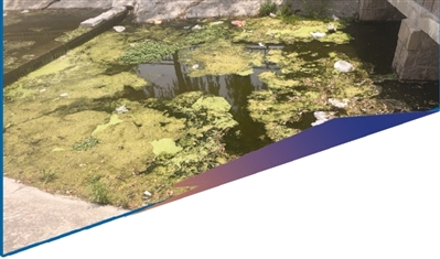 记者沿该河道仔细观察,发现河道内恶臭难闻的河水呈现三种不同的颜色。河道北段位于景尚名都小区内,黄褐色的水从靠近胶州东路的暗渠口流出,在小区内流淌了260多米,经过两座石桥后流入李家河花园小区。由于河道内水量较大,尽管河水浑浊,但异味相对较轻。河道中段位于李家河花园北部,河水呈墨绿色,大部分河面被绿藻和垃圾覆盖,散发出难闻的腥臭味。河道两侧有多个排水口,其中一个排水口内有污水缓缓流出,将周围的河水染成乳白色。河道南段则靠近兰州东路暗渠入口,河水呈青黑色,水量变少,河道底部满是黑色淤泥,散发出刺鼻的臭味,从北段冲刷下来的塑料袋、泡沫板、旧球鞋等垃圾在暗渠入口处堆积。