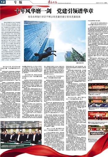 党的建设是推进各项事业的根本保证。在改制十年来的实践中,青岛农商银行党委尝到了党建工作和经营发展深度融合的甜头,也体会到了党建引领发展彰显的澎湃力量。十年风华磨一剑,党建引领谱华章。在充满希望的下一个十年,青岛农商银行党委将切实把党要管党、全面从严治党贯彻与企业改革发展和党的建设全过程,全面实施“党建三年强基行动”,以高质量党建推动青岛农商银行向一流上市银行迈进。